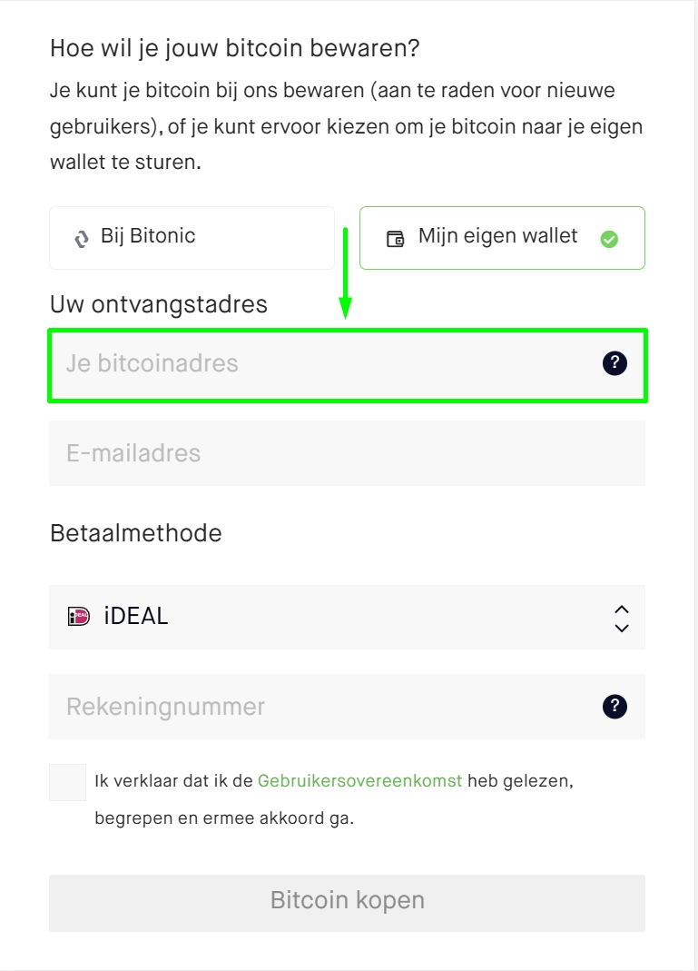 Het moet overkomen dat u de Bitcoin voor uzelf inkoopt, anders mag Bitonic BV de Bitcoin volgens de wet niet opsturen.